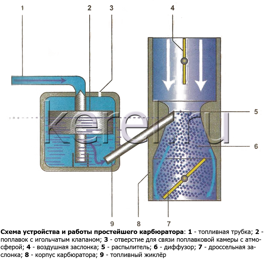 Простейший карбюратор (карбюратор пульверизационного типа) представляет обычный распылитель, соединенный с топливным баком и помещенный в воздушный канал карбюратора (смесительную камеру, или диффузор), напоминающий трубку Вентури. При прохождении по диффузору воздушного потока, там образуется разрежение. Топливо, находящееся в распылителе, захватывается потоком воздуха, дробится на мелкие капельки, смешивается с проходящим по диффузору воздухом и образует горючую смесь. Карбюраторы в нашем автопроме ставили на новые автомобили вплоть до 2009 года, потом пришел запрет, т.к. карбюратор не проходит нормы ЕВРО 3.