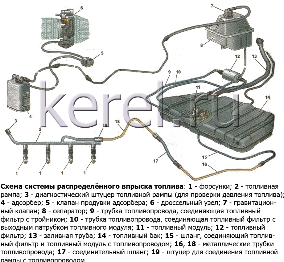 Впрыск бензина с воздухом производится в камеры сгорания принудительно. Давление в топливной рампе, куда подключены все форсунки, обеспечивает электрический бензонасос. Когда распылители потребляют мало горючего, давление в топливной магистрали ограничивается клапаном, сбрасывающим бензин обратно в бак.