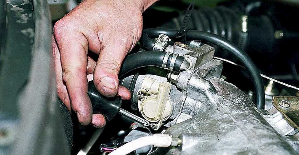 - Затем необходимо ослабить упорный винт заслонки дросселя (этот компонент открывается до конца и отпускается). Когда выполняется это действие, можно услышать щелчок удара об упор.