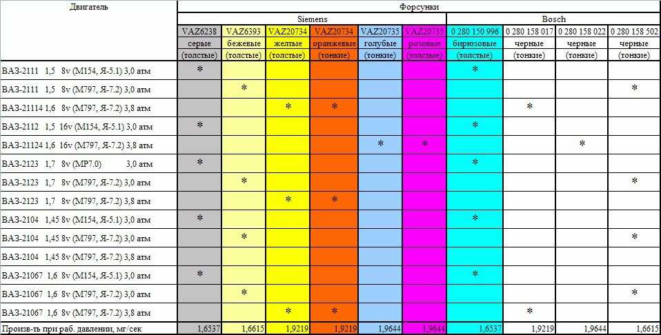10,5. Форсунки могут иметь очень широкий диапазон производительности, например для стандартных бошевских под двигатели ВАЗ — 125-137 см³/мин, а номинальные на «Тойоте» — от 155cc до 430cc. Что касается форсированных двигателей, то там могут стоять даже более чем 1000 cc/min.