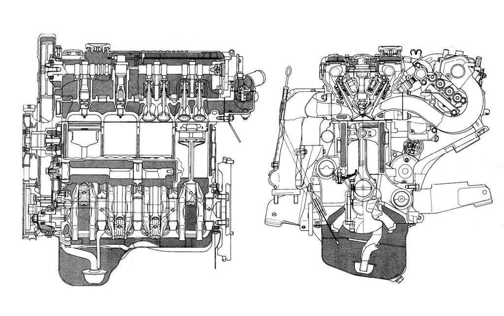 В основе мотора лежит алюминиевый блок цилиндров с чугунными гильзами, в котором со смещением в 10 мм установлен коленвал с ходом поршня 75 мм, длинные шатуны, поршни со своеобразным вытеснителем и высотой 26.9 мм.