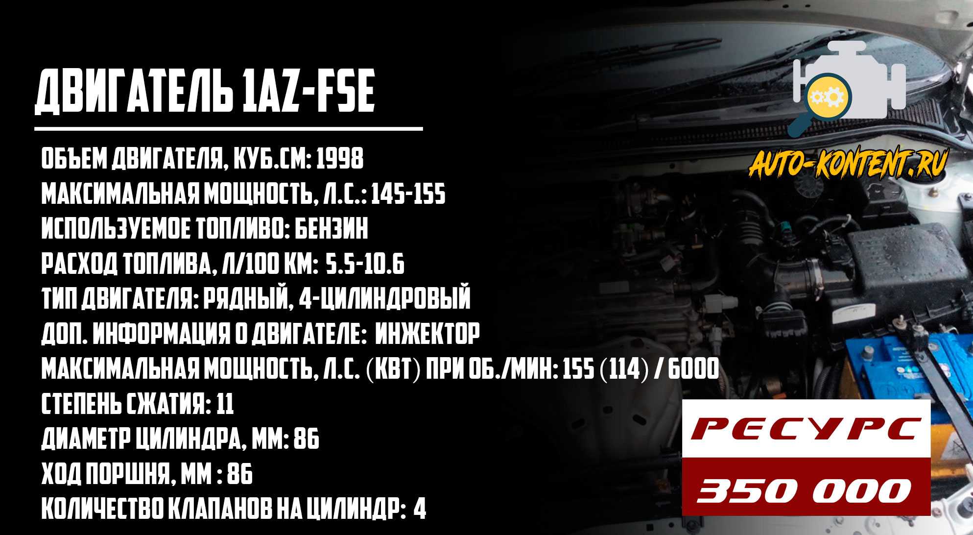 Мощность зависит от прошивку электронного блока управления и может составлять 150-155 лошадиных сил. Крутящий момент при этом равняется 190-200 Нм. От прежнего движка 1AZ-FE отличается не только фирменной системой прямого впрыска топлива, но и облегченной поршневой, жидкостным маслоохладителем. Есть говорить глобально, то это классический силовой агрегат из линейки 1AZ. У него алюминиевый блок цилиндров с чугунными гильзами и алюминиевая «голова». В ГБЦ два распределительных вала DOHC, гидравлические компенсаторы отсутствуют. В приводе газораспределительного механизма однорядная цепь ГРМ, на впуске установлена системе изменения фаз газораспределения VVT-i.