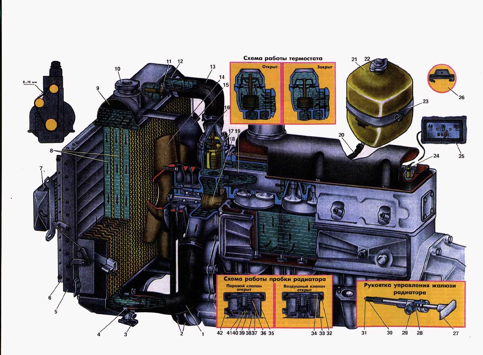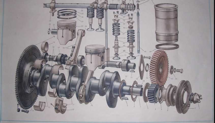 1 — маховик; 2 — монтажная проушина; 3 — кран отопителя; 4 — крышка головки блока цилиндров; 5 — впускной трубопровод; 6 — гайки шпилек крепления головки блока цилиндров; 7 — коромысло клапана; 8 — ось коромысел; 9 — патрубок вентиляции картера; 10 — головка блока цилиндров; 11 — пружины клапана; 12 — маслоотражательный колпачок; 13 — втулка клапана; 14 — крышка маслозаливной горловины; 15 — клапан; 16 — прокладка головки блока цилиндров; 17 — насос охлаждающей жидкости; 18 — штанга; 19 — толкатель; 20 — шкив вентилятора; 21 — распределительный вал; 22 — ведомая шестерня привода распределительного вала; 23 — демпфер крутильных колебаний; 24 — ступица шкива; 25 — шкив; 26 — болт шкива; 27 — манжета; 28 — ведущая шестерня привода распределительного вала; 29 — коленчатый вал; 30 — поддон картера; 31 — гильза цилиндра; 32 — поршень; 33 — пробка маслосливного отверстия; 34 — шатун; 35 — маслозаборник; 36 — масляный насос; 37 — блок цилиндров; 38 — выпускной коллектор; 39 — картер сцепления.