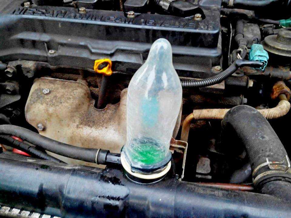 Эти же проявления указывают на прогорание прокладки блока цилиндров, когда отработанные газы сквозь микротрещину попадают в антифриз. В качестве превентивной меры, нужно сменить охлаждающую жидкость, или, если она была совсем недавно заменена, просто слить в емкость, залив затем обратно в систему — по инструкции. Убедившись, что воздушной пробки нет, надо проверить, не раздувает ли радиатор и патрубки избыточное давление: снять пробку радиатора, плотно надеть на горловину презерватив или целый полиэтиленовый пакет, после — завести мотор. В исправной системе их раздувать не должно.