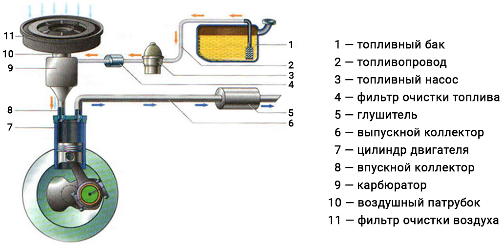 Общая схема системы питания карбюраторного двигателя