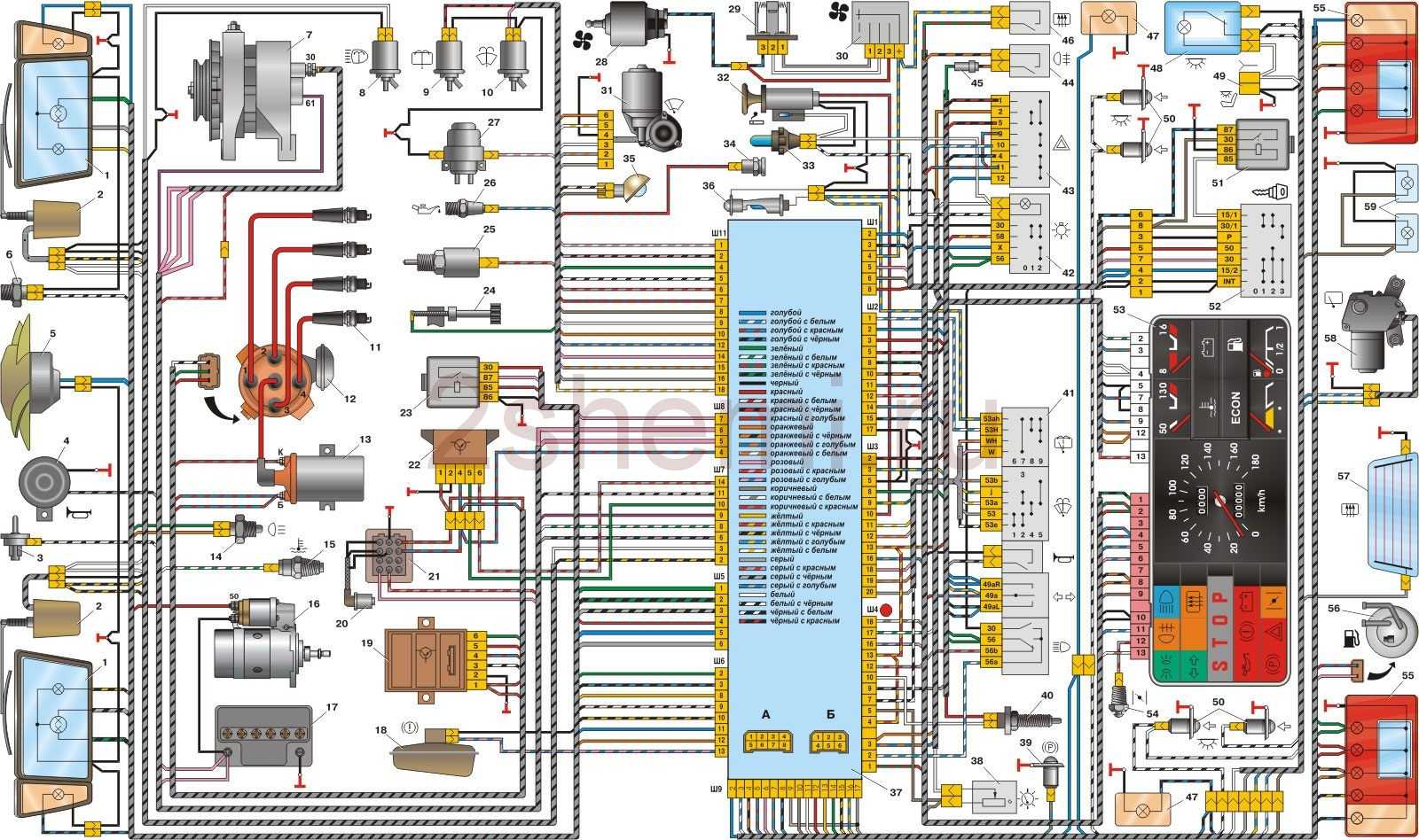 - Все электрооборудование и приборы, питающиеся от напряжения, основаны на однопроводном соединении. Специалисты концерна ВАЗ при разработке схемы бортовой сети продумали, чтобы электроцепи определенной расцветки отвечали за конкретные опции. Поэтому определенные приборы соединяются посредством электролиний определенных цветов. Благодаря этому владелец машины может сам разобраться в схеме электросети, что позволит самостоятельно выполнять ремонт.