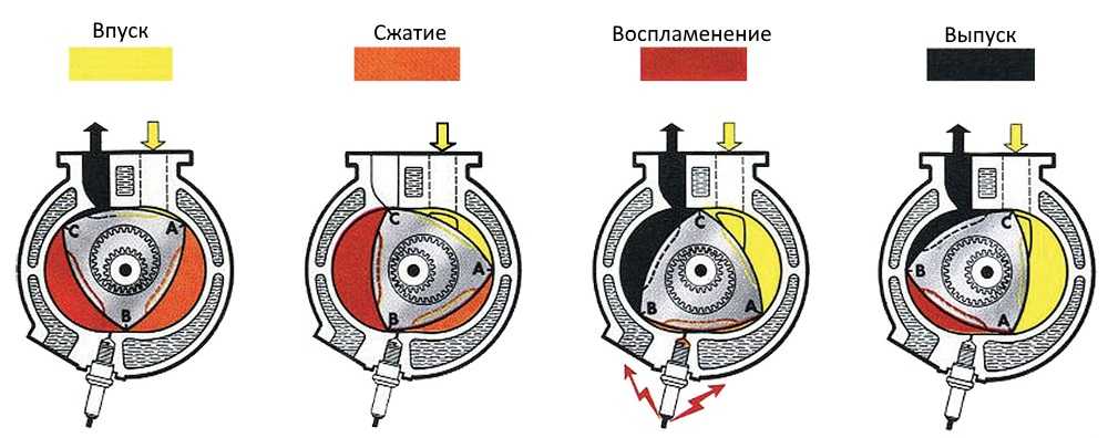 Поскольку цилиндр роторного двигателя имеет впускные и выпускные окна, то надобность в газораспределительном механизме отпала, при этом сам процесс работы сохранил все четыре такта по отдельности.
