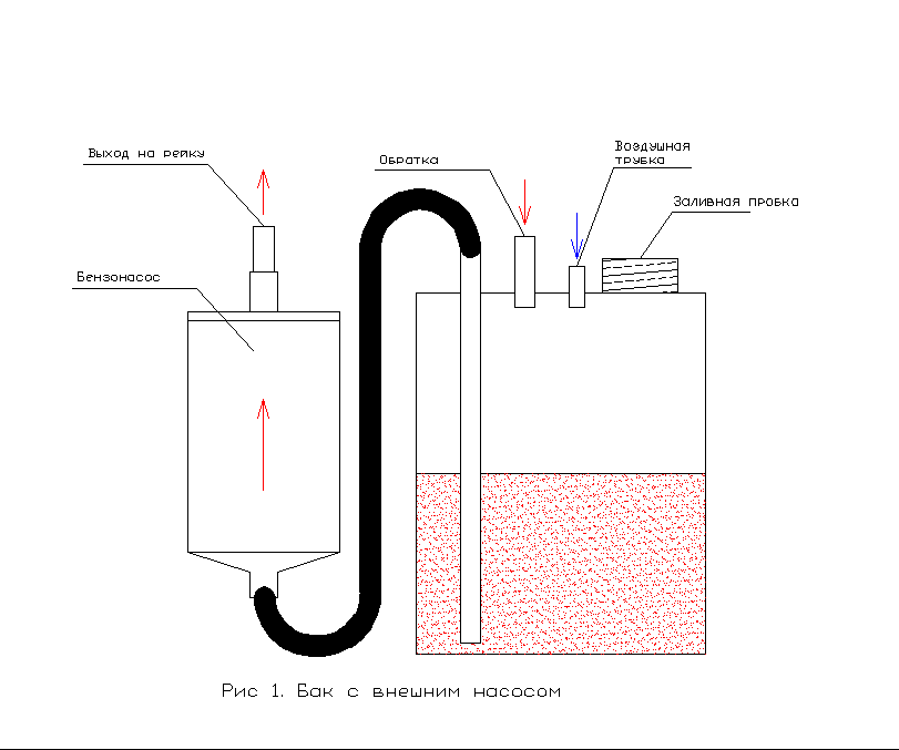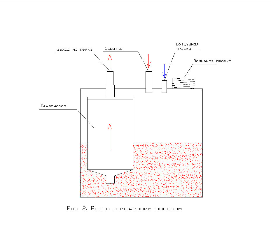 Система подачи жидкости — присутствует в любом автомобиле, это — бензобак и бензонасос. Позаимствуем эту систему немного в упрощённом виде. Для этого нам будет нужен бензонасос и бак. В баке должен быть выход, обратка, заливное отверстие и сопун для воздуха (чтоб не создавать разряжения в баке). Бак можно сделать по разному: