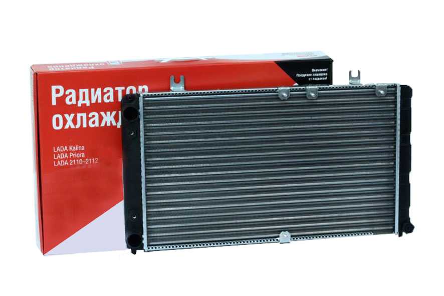 Радиатор трубчато-пластинчатый, алюминиевый, с пластмассовыми бачками, двухходовой, с перегородкой в левом бачке. В внизу справа находится сливная пробка 6. В бачках выполнены подводящий и отводящий патрубки шлангов к водяной рубашке двигателя, а также патрубок шланга, соединяющего радиатор с расширительным бачком.