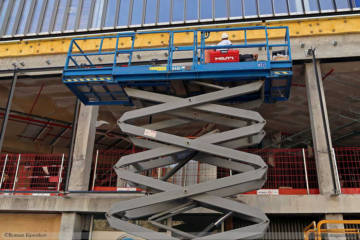 В подъемниках этого типа один или несколько гидравлических цилиндров воздействуют на ножничных шарнирно-рычажный механизм.