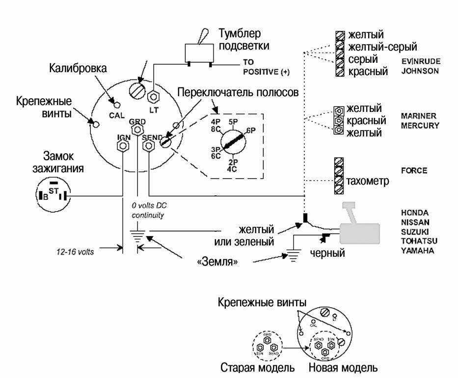 Аналогичным образом производится поиск проводов генераторной катушки и подключение регулятора на моторах других марок и моделей. Отсюда и универсальность тахометров, предназначенных для подвесных моторов — как правило, с обратной стороны на них установлен специальный переключатель-селектор, поворотом которого выставляется режим, соответствующий числу полюсов магдино. Прибор может работать в двух режимах. Как выбрать тахометр Рынок аксессуаров и устройств для лодок и моторов разнообразен. Выбор рулевого лодочного троса Первое при выборе троса — правильно рассчитать его длину.