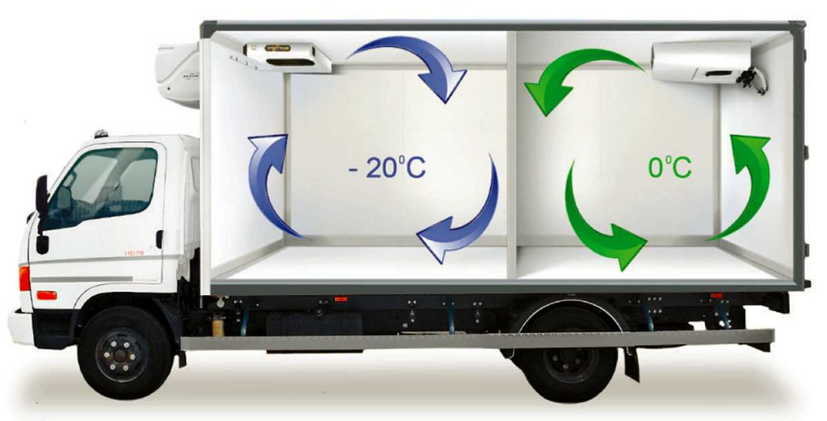 Существуют также мультитемпературные транспортные средства с разделённым при помощи подъемно-сдвижных или стационарных перегородок кузовом. Они могут поддерживать различный температурный режим в разных отсеках.