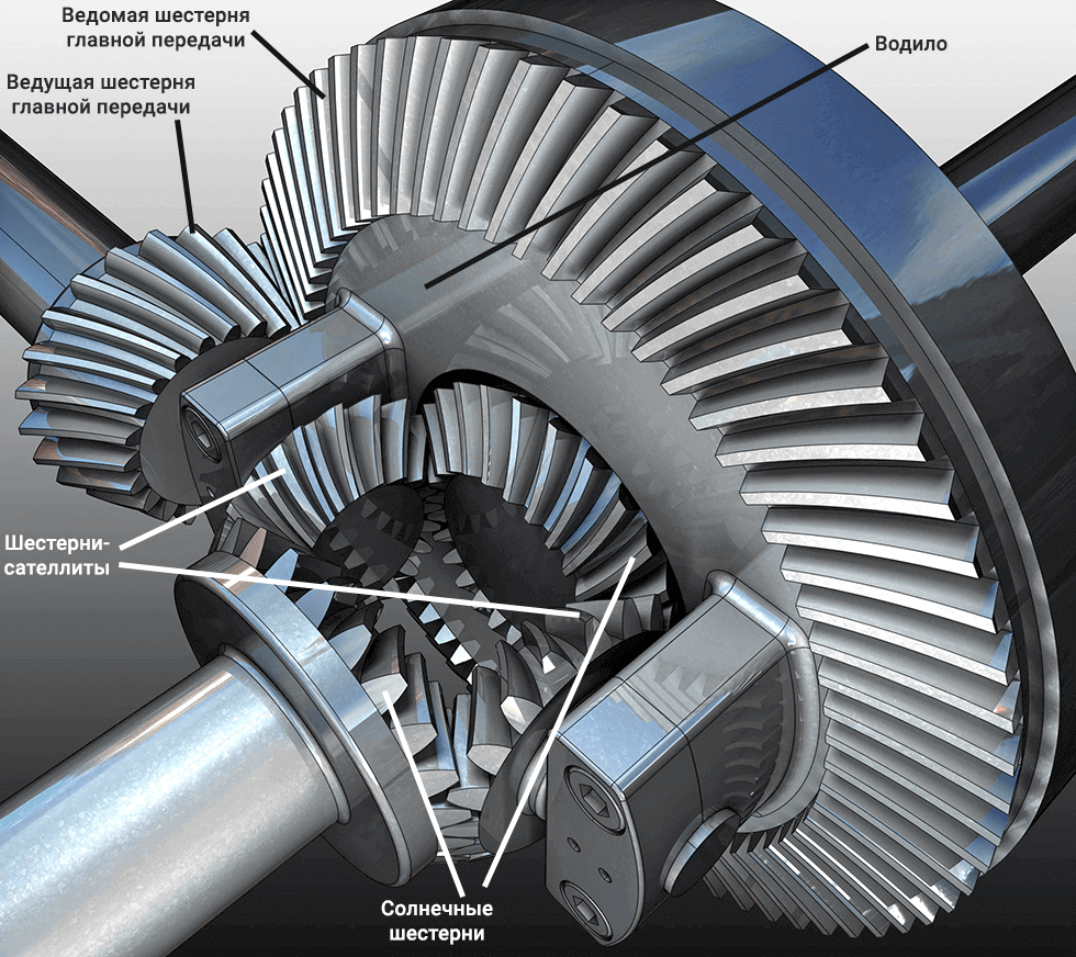 При вхождении в поворот полуосевая шестерня, которая связана с отстающим колесом, приводит во вращение сателлит, а он уже передает вращение на другой сателлит шестерню полуоси. Благодаря такой жесткой кинематической связи колеса автомобиля вращаются с разной угловой скоростью.