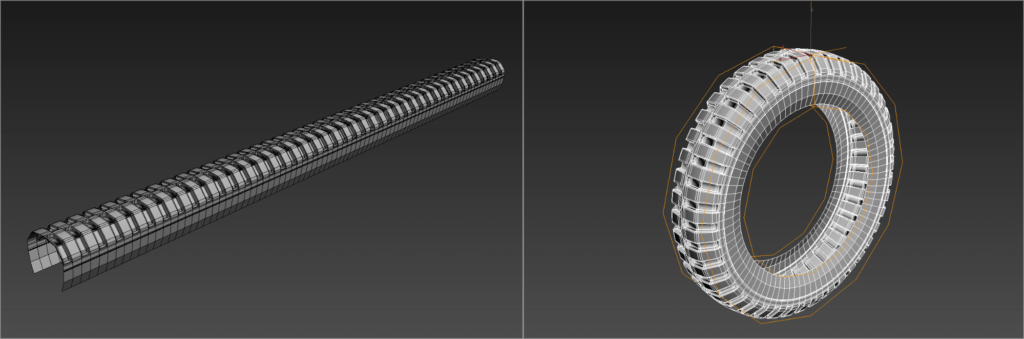 С помощью функции Weld мы объединили все элементы и добавили два модификатора Bend. Первый нужен для того, чтобы сделать поверхность шины выпуклой, а второй — чтобы создать из плоскости окружность. В последнюю очередь мы использовали Weld Vertices. Если у вас возникают сложности с замыканием окружности, добавьте Reset Xform и правильно выставьте пивот объекта перед использованием модификатора Bend.