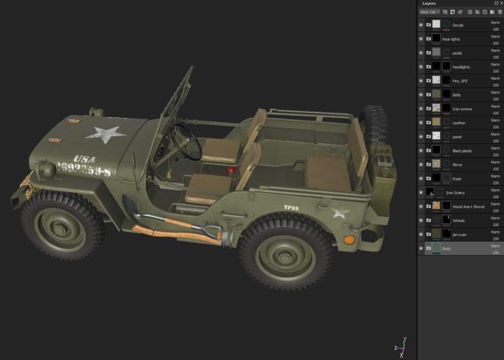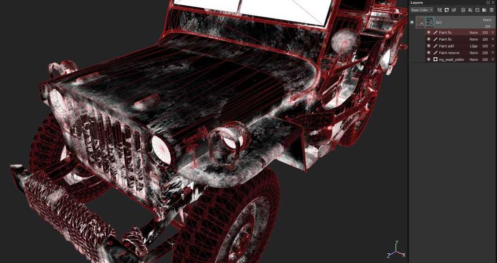Благодаря референсам мы поняли из каких материалов сделан джип, какова их структура, где собирается грязь, как выглядит детализация поверхностей и какие части машины наиболее подвержены повреждениям. Для текстурирования мы использовали Substance Painter 2.6.2.