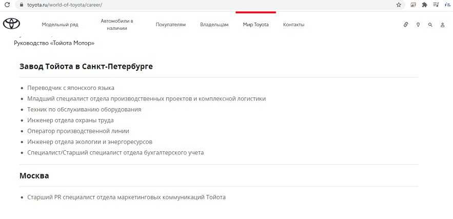 Еще одним минусом, который отмечают многие сотрудники Toyota в России – карьерный рост практически невозможен. Текучки персонала на руководящем уровне почти нет, как и его продвижения. Поэтому рост из рядовых сотрудников в руководители может занимать десятилетия. Это, кстати, свойственно многим японским компаниям – рост в них очень медленный. Впрочем, во всех компаниях-автопроизводителях в России ситуация схожа. Об этом вы можете почитать в наших статьях о них: