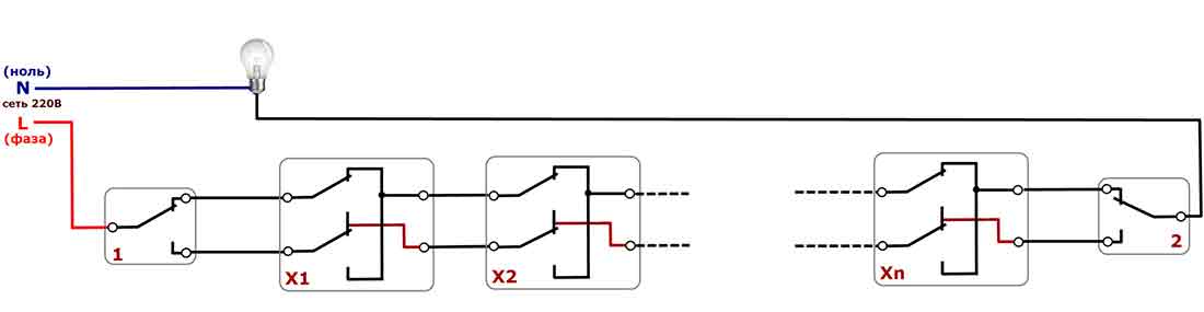 Схема управления освещением из пяти мест и более с помощью проходных и перекрестных выключателей (1 и 2 — проходные, х1, х2 …хn — перекрестные)