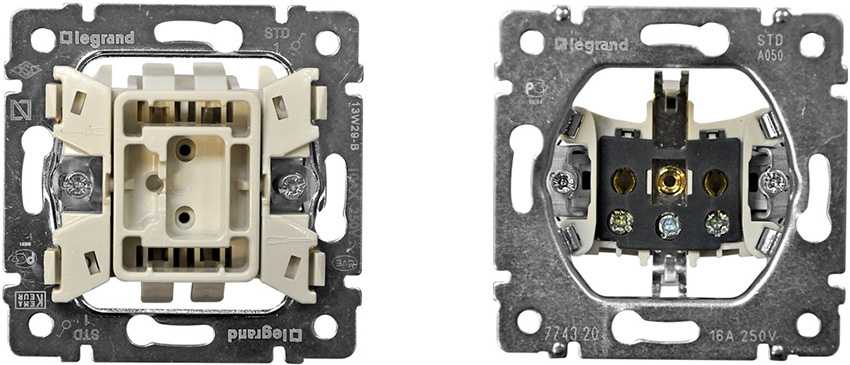 Конструкция переключателя предусматривает наличие четырех контактов, из которых два подсоединяются к клеммам одного переключателя и еще два – ко второму прибору.