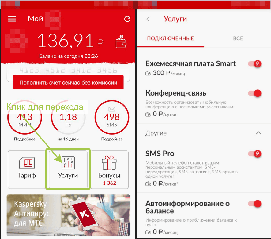 - зайдите в «Мой МТС» с сайта или приложения и отключите в разделе Тарифы и услуги – «Управление услугами» для подключения.