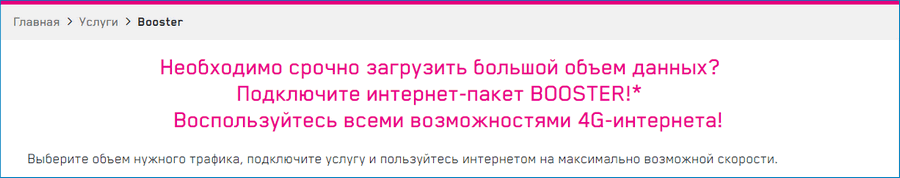 - подключение второго и следующего пакета «Booster» невозможно, когда не израсходован ранее запрошенный трафик.