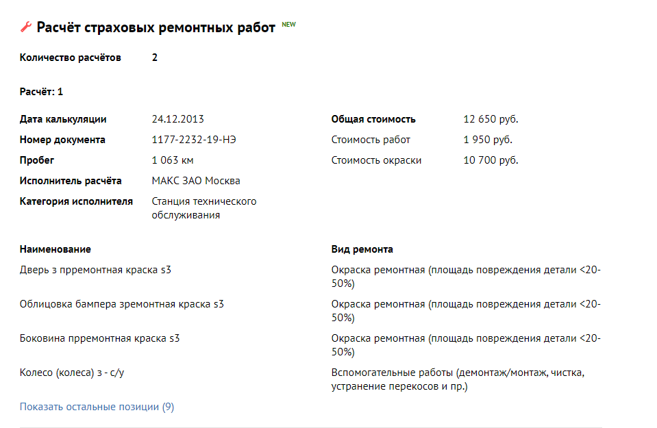 Рассмотрим пример того, как выглядит расчет страховых ремонтных работ: