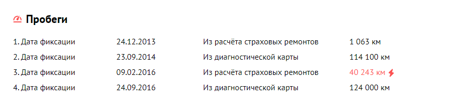 Данные позволяют узнать актуальный пробег автомобиля и помогают распознать, был ли скручен пробег, и если да – то в какой период времени.