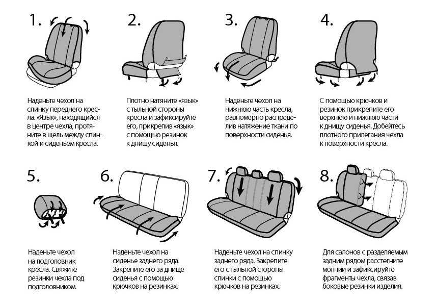 Для тех, кто спешит, приводим краткую пошаговую инструкцию по установке чехлов на задний и передний ряд. Но видео рекомендуем посмотреть в любом случае — оно интересное.
