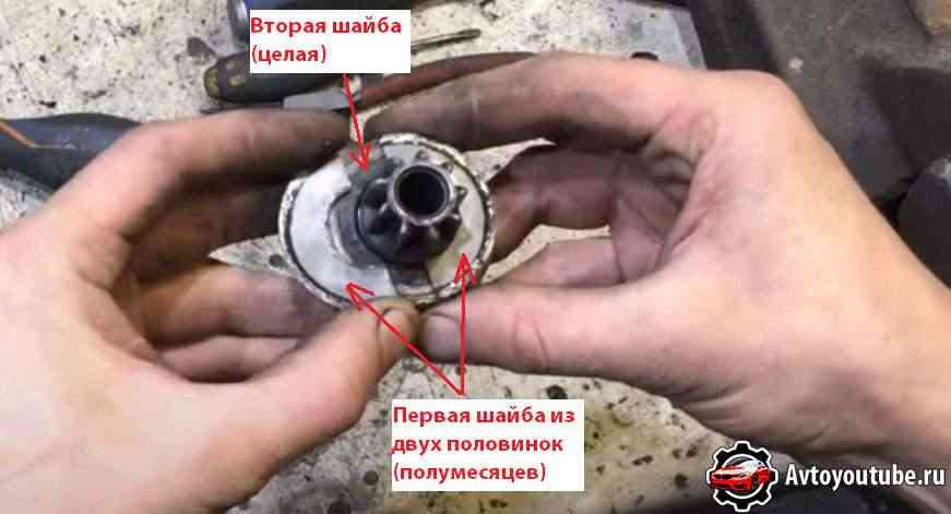 Снимаем стопорное кольцо и шайбу. Снимаем с вала якоря электродвигателя бендикс с обгонной муфтой и шестернёй. Теперь нужно развальцевать его две части.
