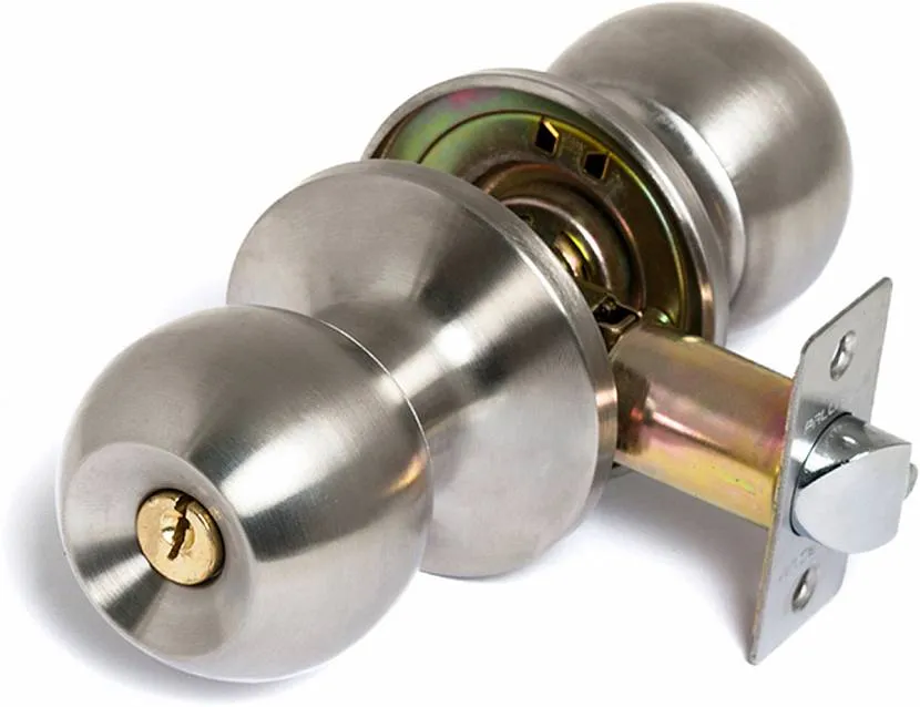 Следующий тип – поворотный. Чаще производители изготавливают такие ручки или в виде шара, или в виде кнопки. Диаметр устройства – 50-60 мм. В центре располагается замочная скважина. Она может располагаться на каждой ручке или только на одной, то есть с определённой стороны. Название модель получила лишь потому, что дверь можно открыть, только повернув ручку вокруг своей оси. Часто производители комплектуют этот поворотный аксессуар блокиратором. Такие модели обычно устанавливают в туалетах и ванных комнатах. Добавим для информации, что такие ручки называют «кнобами».
