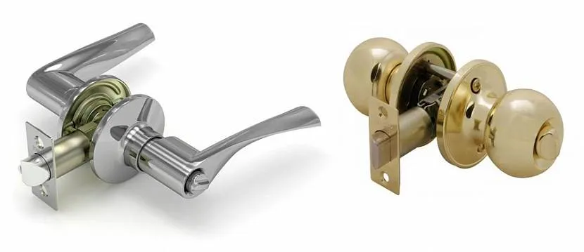 Теперь о нажимных моделях. Чисто конструктивно это два Г-образных рычага. Они соединяются между собой стальным стержнем, проходящим насквозь через дверное полотно. В конструкции изделия присутствует язычок, который запирает дверь, входя в отверстие в дверной коробке, расположенной напротив торца полотна. Такие ручки используют и на входных дверях, и на межкомнатных. Нажимные модели обладают большим количеством преимуществ, где хотелось бы выделить большой эксплуатационный ресурс и высокую надёжность.