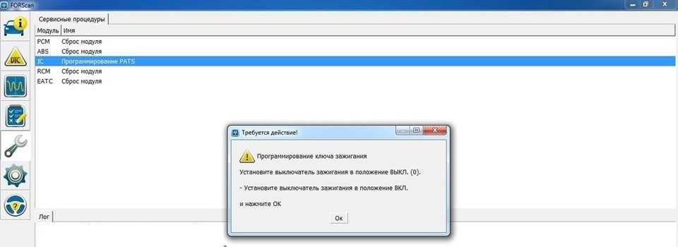 Все существующие ключи были стерты из модуля. Теперь необходимо записать заново ключи.Переходим во вкладку «Сервисные процедуры», выбираем «программирование PATS»Далее выбираем «Программирование ключа зажигания»