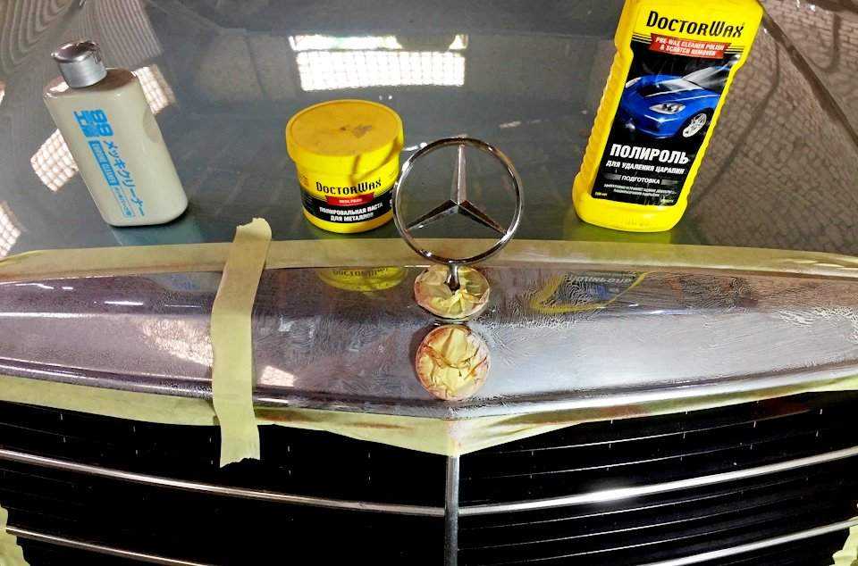 - специализированные очистители для хрома. К примеру, Soft99 Chrome Cleaner или средство от Doctor Wax (DW8317), «Очиститель хрома» от GRASS и т.д. Производители средств заверяют, что состав их химических реактивов и мелкий абразив способны не только снять окислы и помутнения, но и создать защитную пленку. Так вы сможете защитить детали от дальнейшего разрушения. Часто такие средства позиционируются, как полировальные пасты для удаления помутнений и потертостей. Поэтому при большом количестве коррозии их рекомендуется использовать в качестве финальной стадии придания товарного вида.