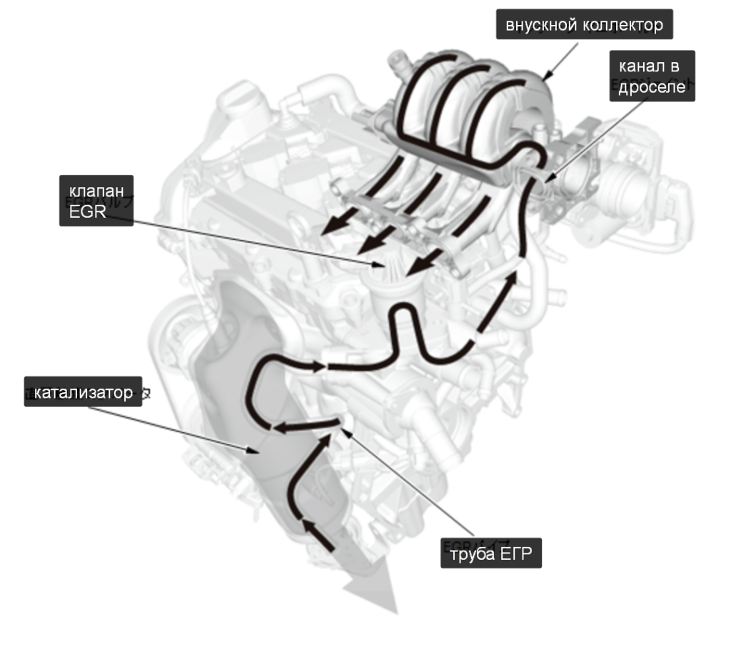 Часть выхлопных газов удаляется сразу после каталитического нейтрализатора непосредственно под ним и вводится непосредственно во впускной коллектор через клапан EGR. За счет использования выхлопных газов, очищенных каталитическим устройством, в качестве газа рециркуляции отработавших газов, предотвращается загрязнение корпуса дроссельной заслонки и впускного коллектора и засорение канала рециркуляции отработавших газов.