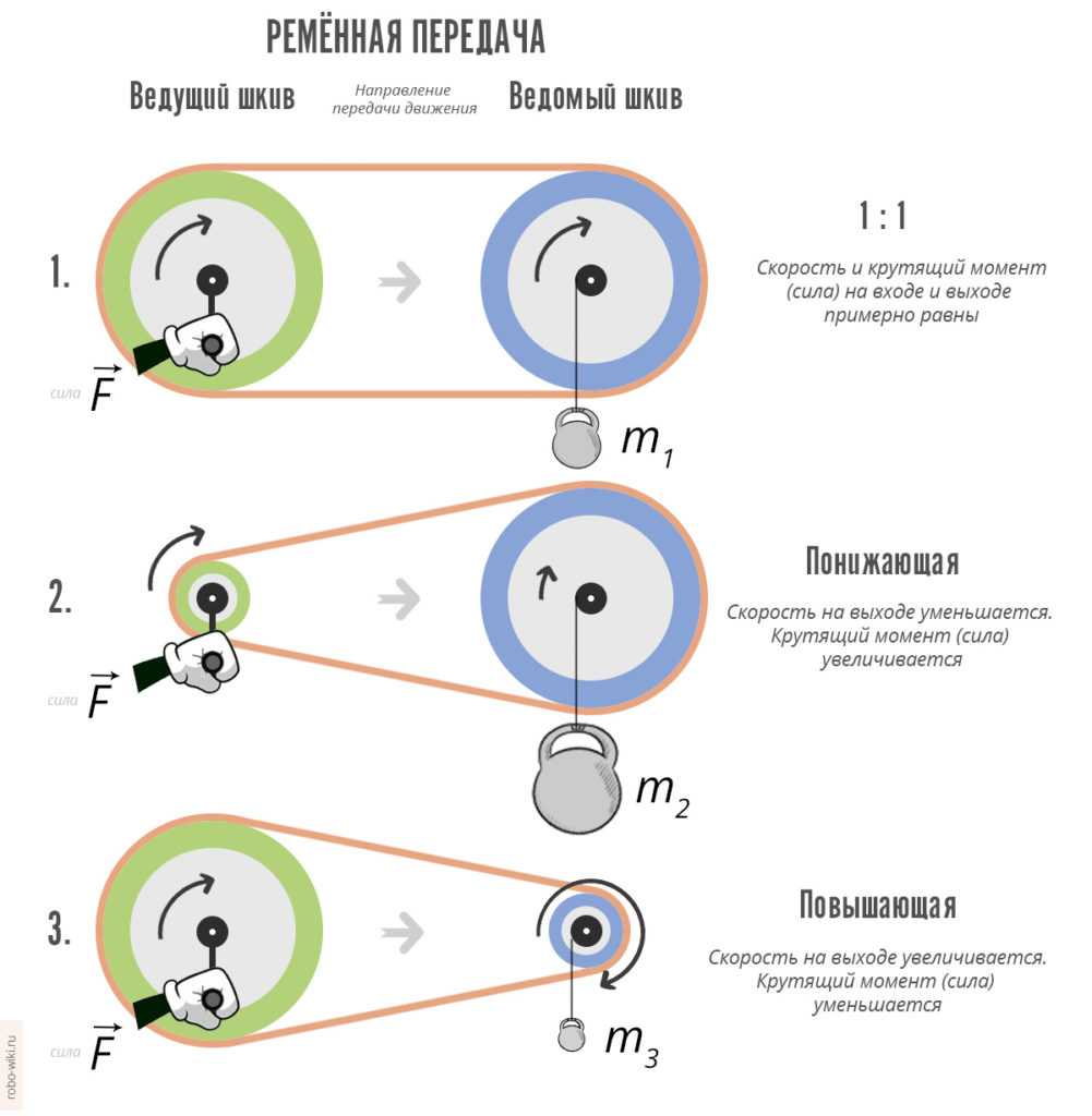 Эти схемы с понижающей и повышающей ремённой передачей наглядно демонстрируют работу золотого правила механики — за выигрыш в силе приходится платить таким же проигрышем в расстоянии (схема 1) или за выигрыш в расстоянии приходится платить таким же проигрышем в силе (схема 2).