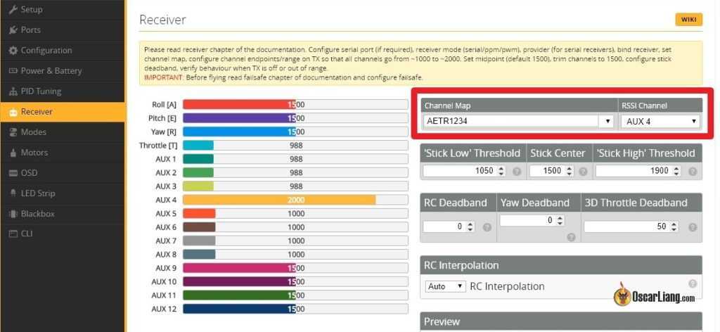 Откройте Betaflight, перейдите во вкладку Receiver, выберите канал Aux, который будете использовать для LQ. Для Ch8 вы должны выбрать «AUX 4«. (Минус каналы throttle, yaw, pitch и roll).