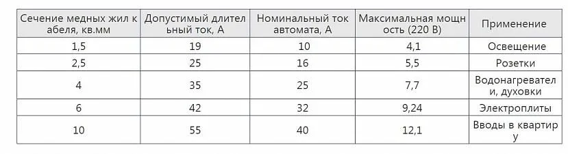 Таблица автоматов по мощности и силе токаИсточник santehmarka.ru