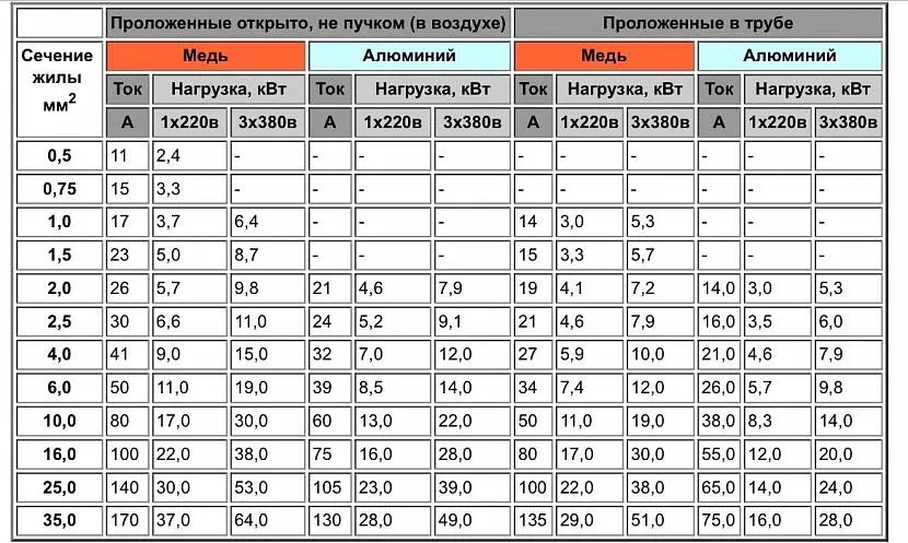 | Проводимость тока, кВт | Не более 3 при минимальных сечениях кабеля | Превышает примерно в 1,6 раз |