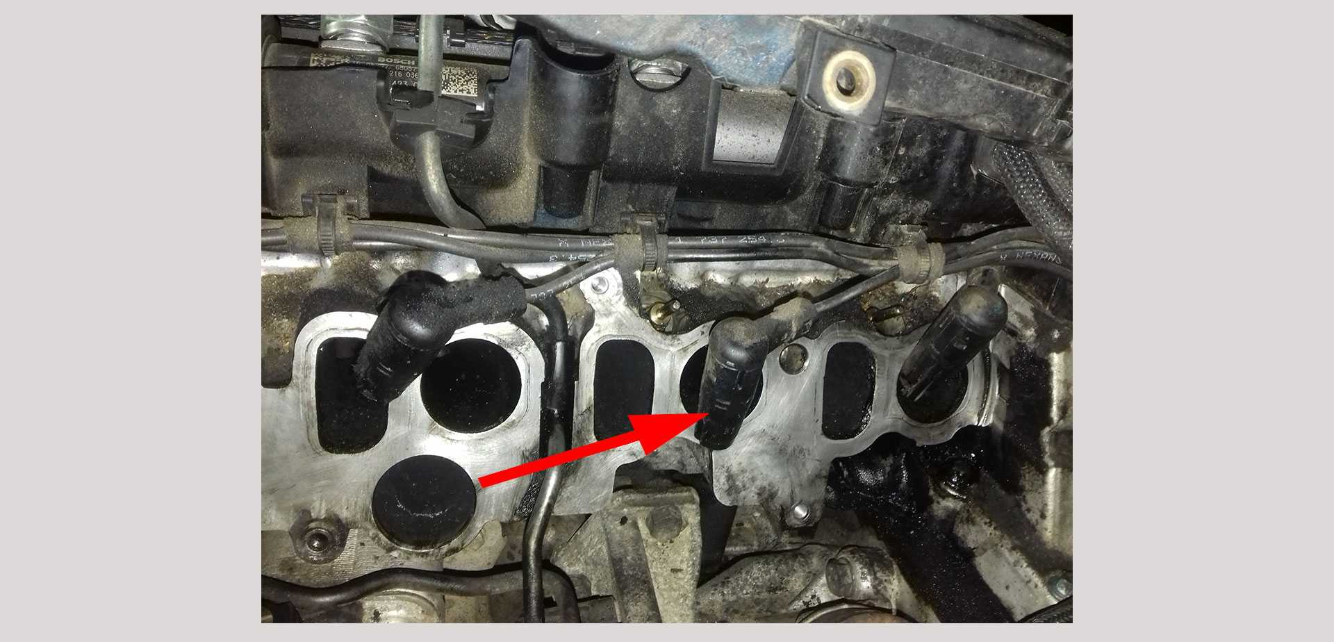 - Следы моторного масла на чехле катушки зажигания указывают на протечку прокладки крышки (крышки картера). Поскольку масло очень агрессивно по отношению к силиконовой изоляции чехла, уплотнение крышки картера необходимо заменить перед повторной установкой катушек зажигания.