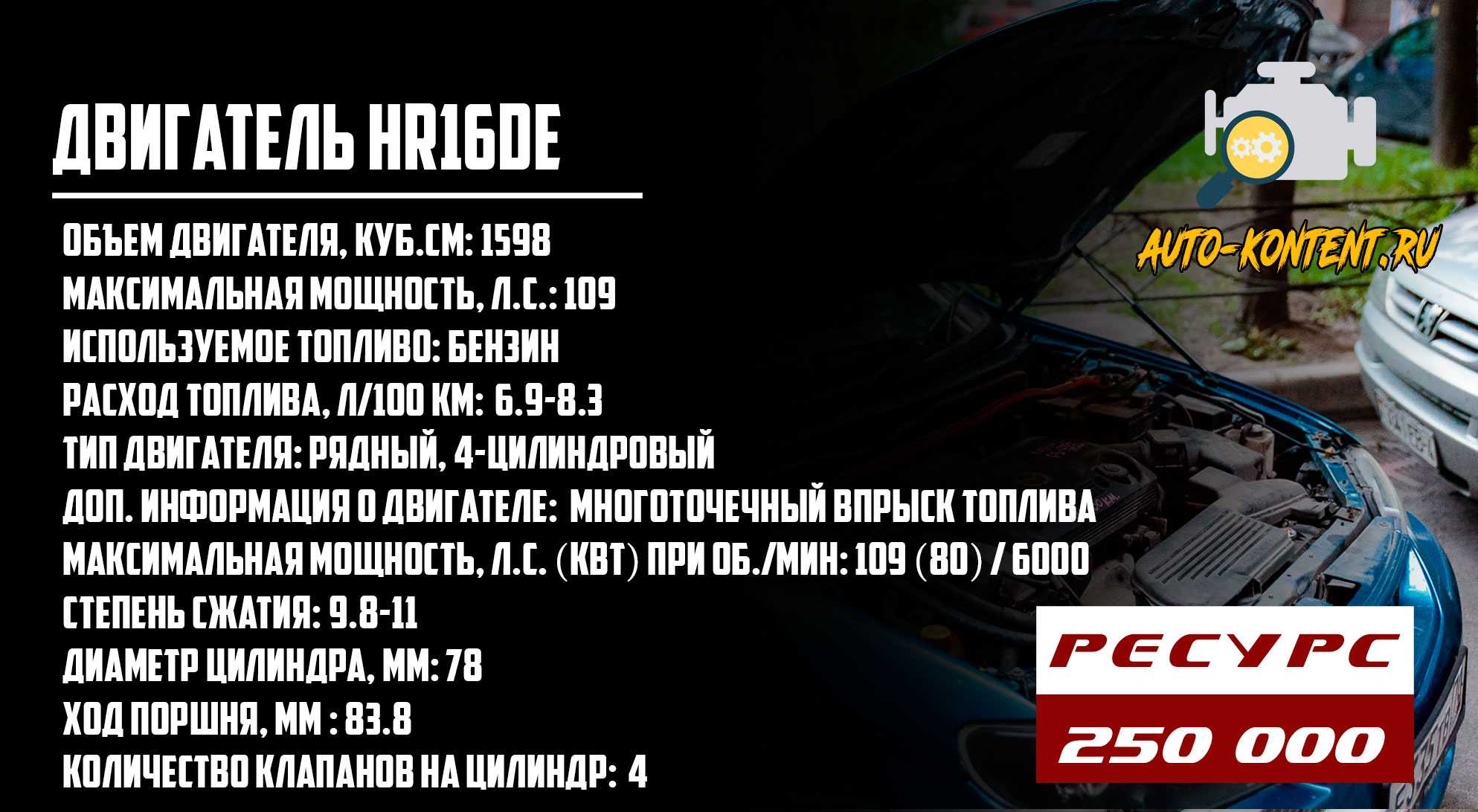 1.6-литровый силовой агрегат, выпускаемый компанией Ниссан с 2005 года. Именно тогда впервые стало известно об этом двигателе. Его сборка была налажена в городе Токио на автомобильном заводе. Даже сегодня HR16DE активно ставят на некоторые массовые модели. АвтоВАЗ собирают одну из модификаций двигателя, известную под маркировкой H4MK. Это рядный силовой агрегат с рабочим объемом 1598 куб. см, инжекторная система питании. Диаметр цилиндров 78 мм, ход поршня составляет 83.6 мм. В зависимости от настроек мощность двигателя составляет 105-120 лошадиных сил. Крутящий момент также может быть разным – от 140 до 160 Нм. Двигатель работает на топливе АИ-92 без каких-либо проблем. В целом неприхотливый и достаточно надежный. Его блок цилиндров рядный 4-цилиндровый, изготовленный из алюминия. Головка блока цилиндров 16-клапанная также изготовлена из алюминия. Чугунные гильзы и открытая рубашка системы охлаждения. Гидрокомпенсаторы отсутствуют, вместо них цельные толкатели. На впуске установлен фазорегулятор. Газораспределительный механизм с приводом от цепи ГРМ.